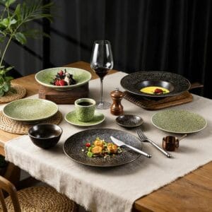 This tableware set centers on mottled grain glaze + dark green/ dark brown dual tones design, crafted from ceramic. The glaze features fine grain texture, paired with vintage dark green and dark brown hues. It fits the dining scenarios of creative restaurants, forest-style private banquets, and retro-themed home tables, infusing a natural yet high-end texture into meals.