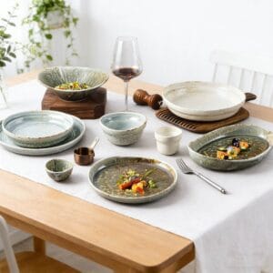 • Irregular Handcrafted Vessel Shapes: Unique irregular outlines and artisanal details enhance the pastoral/rustic dining atmosphere.